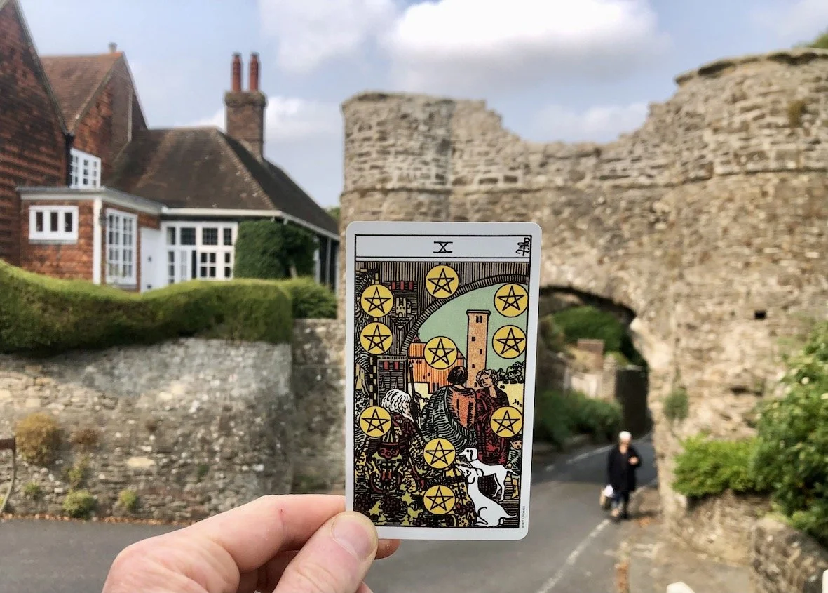 The Rider Waite Smith deck is the most iconic of tarot decks, and something of a gateway into the world of magic and the Devil's Uno. The artist Pamela Colman Smith was living in the small town of Winchelsea in East Sussex while painting the images, and much of the iconography was drawn from the world around her. Tower Cottage where she lived, for example, and the tower next door both feature on the 10 of Pentacles - a correspondence that is entirely appropriate for the card which alludes to the most concretised aspect of the suit of earth, the bricks of your house. The wall of the garden features in the Sun card, and the placement of the sun in the card is right where it would have risen as seen from over the road.